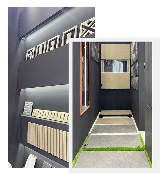 展廳地面不僅呈現(xiàn)了生態(tài)石英磚的鋪貼方式,還讓產(chǎn)品肌理與植物、與鵝卵石還原了真實的花園庭院環(huán)境,讓大家能身臨其境,打破固有束縛,塑造富有自然氣息的生態(tài)感,實現(xiàn)了人與空間的多維互動。展館空間的整體美感離不開每一處構造與產(chǎn)品的完美結合,靈動唯美的最全花色樣磚如畫作般展示于墻上,從正面到側面到背面,讓現(xiàn)場參觀者全方位了解“30mm厚磚新時代”。