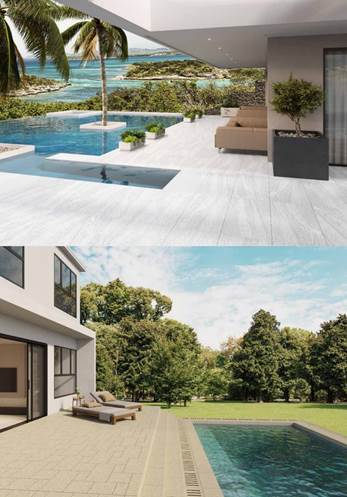 以生態(tài)石英磚高端花色打造“泳池磚”絕美體驗,搭配沙灘躺椅、遮陽傘、扶梯等泳池經(jīng)常出現(xiàn)的物件,疊加景觀樹、鏡子、墊子等一系列概念性道具和元素,增強游泳池的時尚概念,引領高端酒店泳池打造、戶外建筑裝飾風潮!
