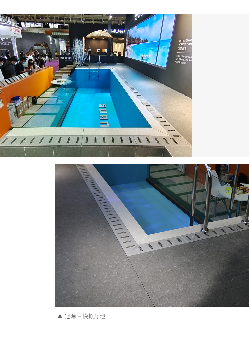以生態(tài)石英磚高端花色打造“泳池磚”絕美體驗,搭配沙灘躺椅、遮陽傘、扶梯等泳池經(jīng)常出現(xiàn)的物件,疊加景觀樹、鏡子等一系列概念性道具和元素,增強游泳池的時尚概念,引領(lǐng)高端酒店泳池打造、戶外建筑裝飾風(fēng)潮!